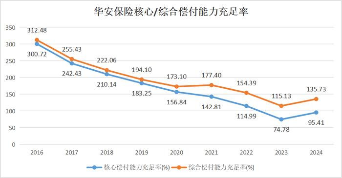 2023年末之前,华安保障的偿付才能捏续走低,2023年4季度概述偿付才能弥散率为115.13%,同比下落39.26个百分点,较2016年下落197.35个百分点;中枢偿付才能弥散率为74.78%,同比下落40.21个百分点,较2016年下落225.94个百分点。
